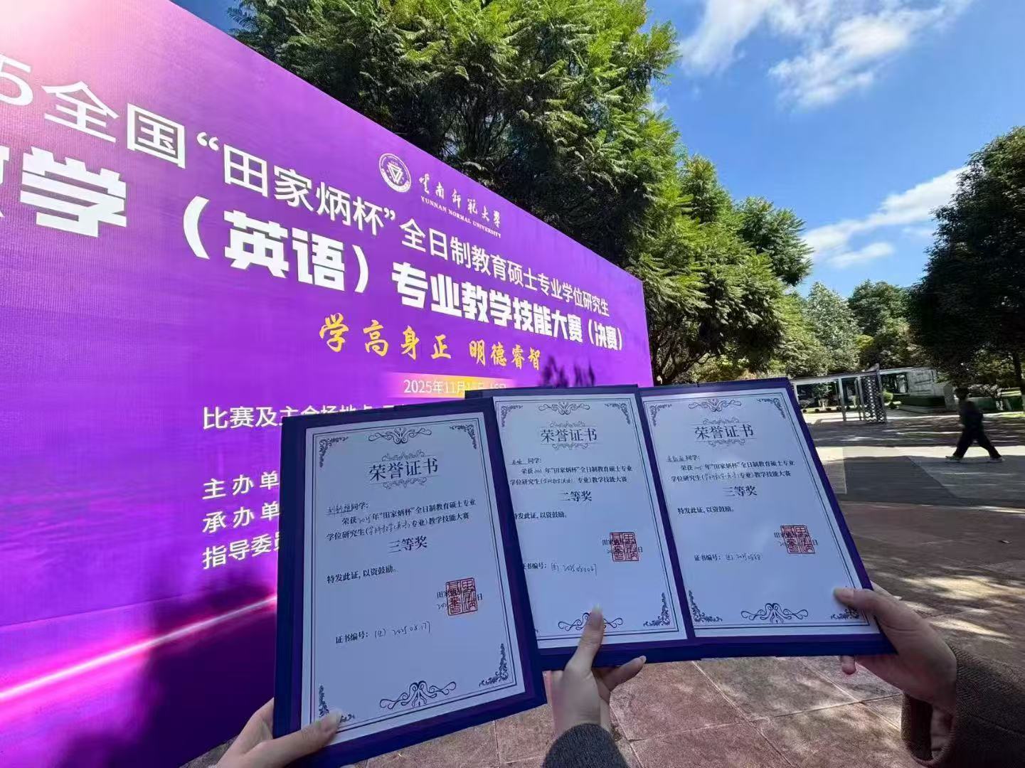 近日,2025年“田家炳杯”全日制教育硕士学科教学(英语)专业教学技能大赛决赛在云南师范大学圆满落幕。车震视频 在该项赛事中取得优异成绩。经过激烈角逐,车震视频 24级学科教学(英语)专业研究生高曦获全国二等奖,朱凯丽、刘舒雅获全国三等奖,范丽娟教授获优秀指导教师奖。